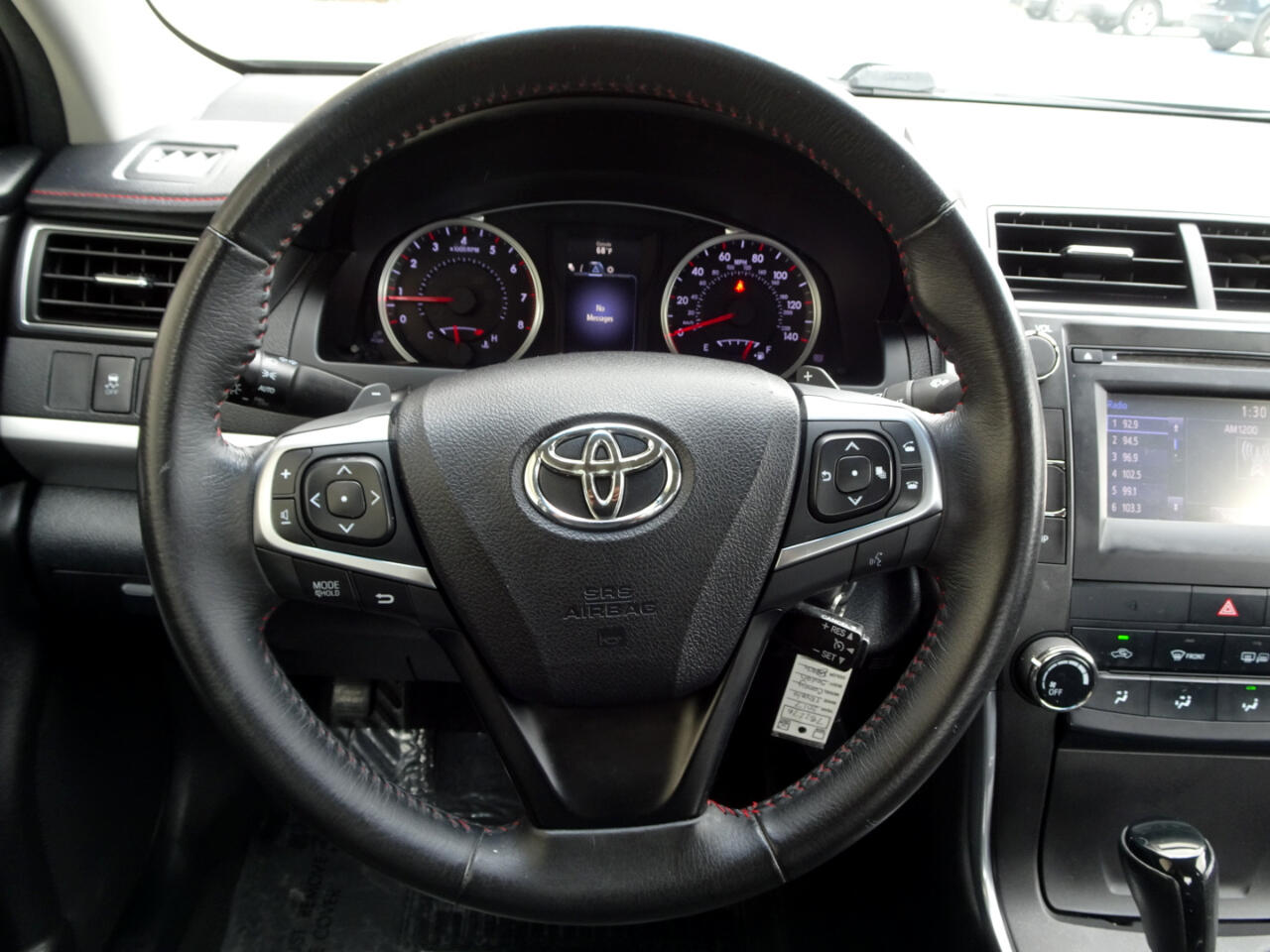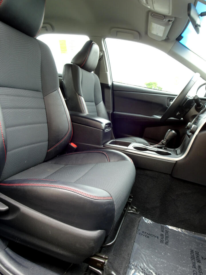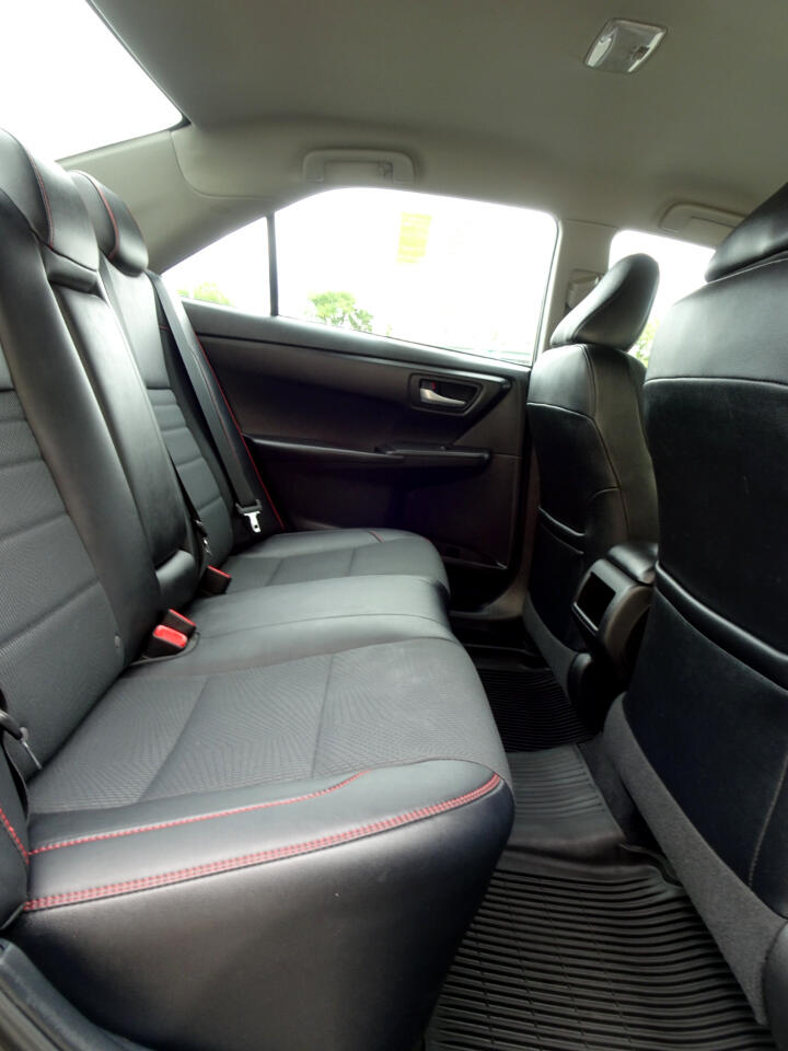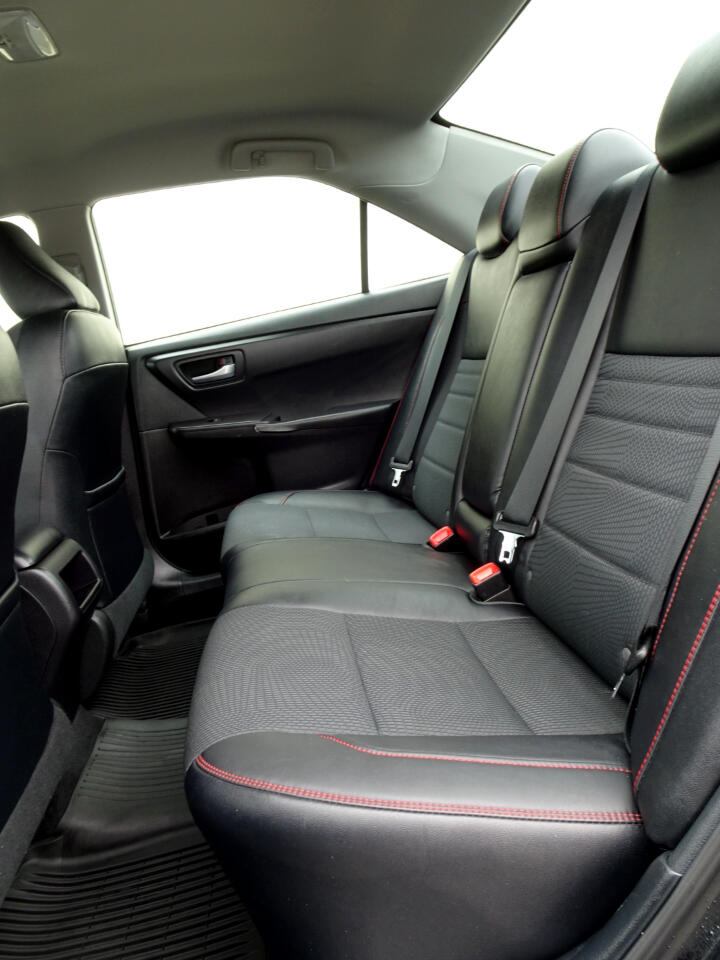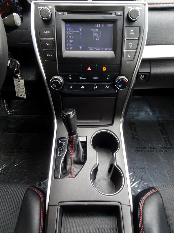 We have this beautiful vehicle for you, a 2017 Toyota Camry. With leather seats with a beautiful red thread detail, navigation, a rear camera, good sound so you can listen to your favorite songs, and you can save gas. Come, drive it and enjoy it. It can be yours today.